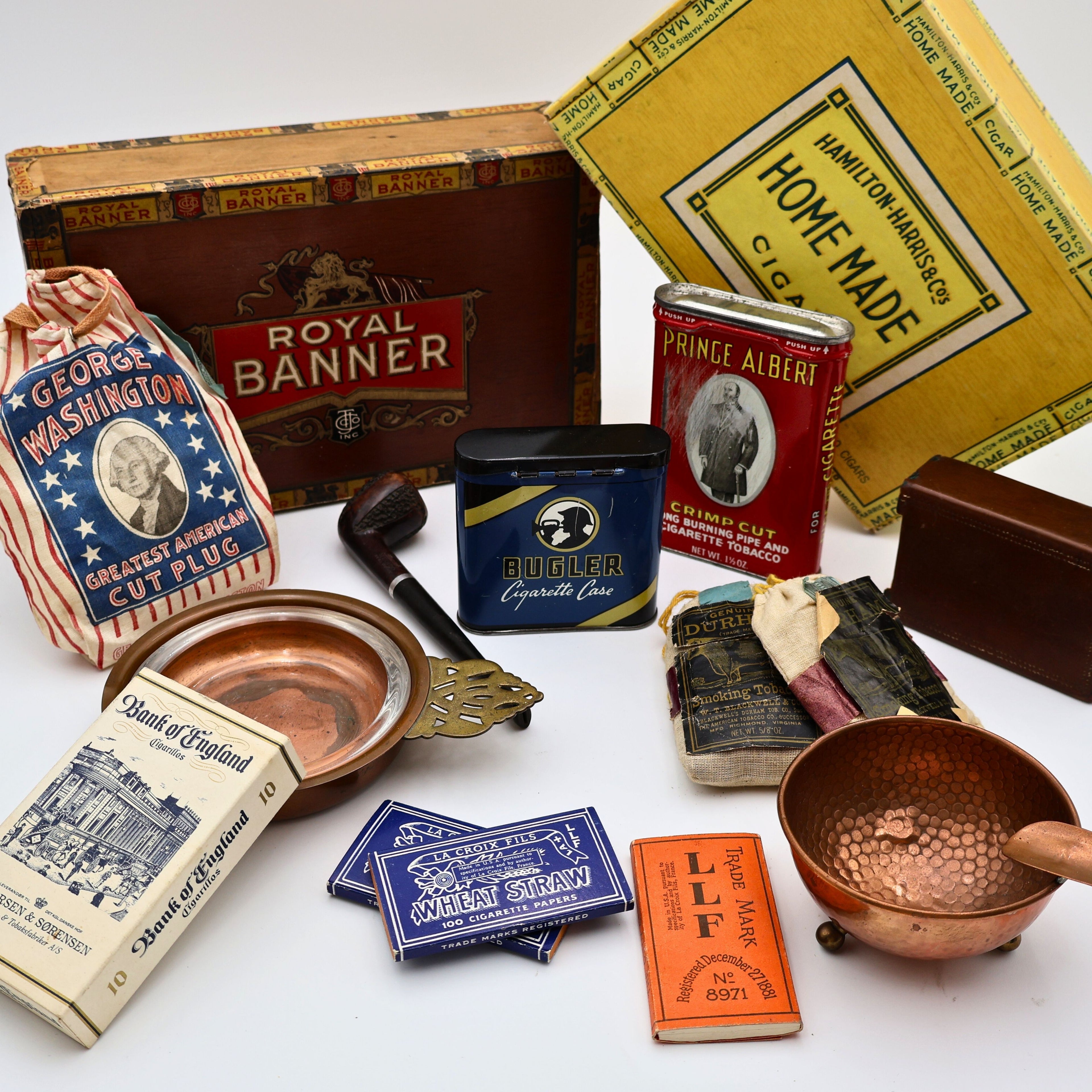 Cigar boxes, tobacco tins, pipes, papers, and ashtrays collected from a time...