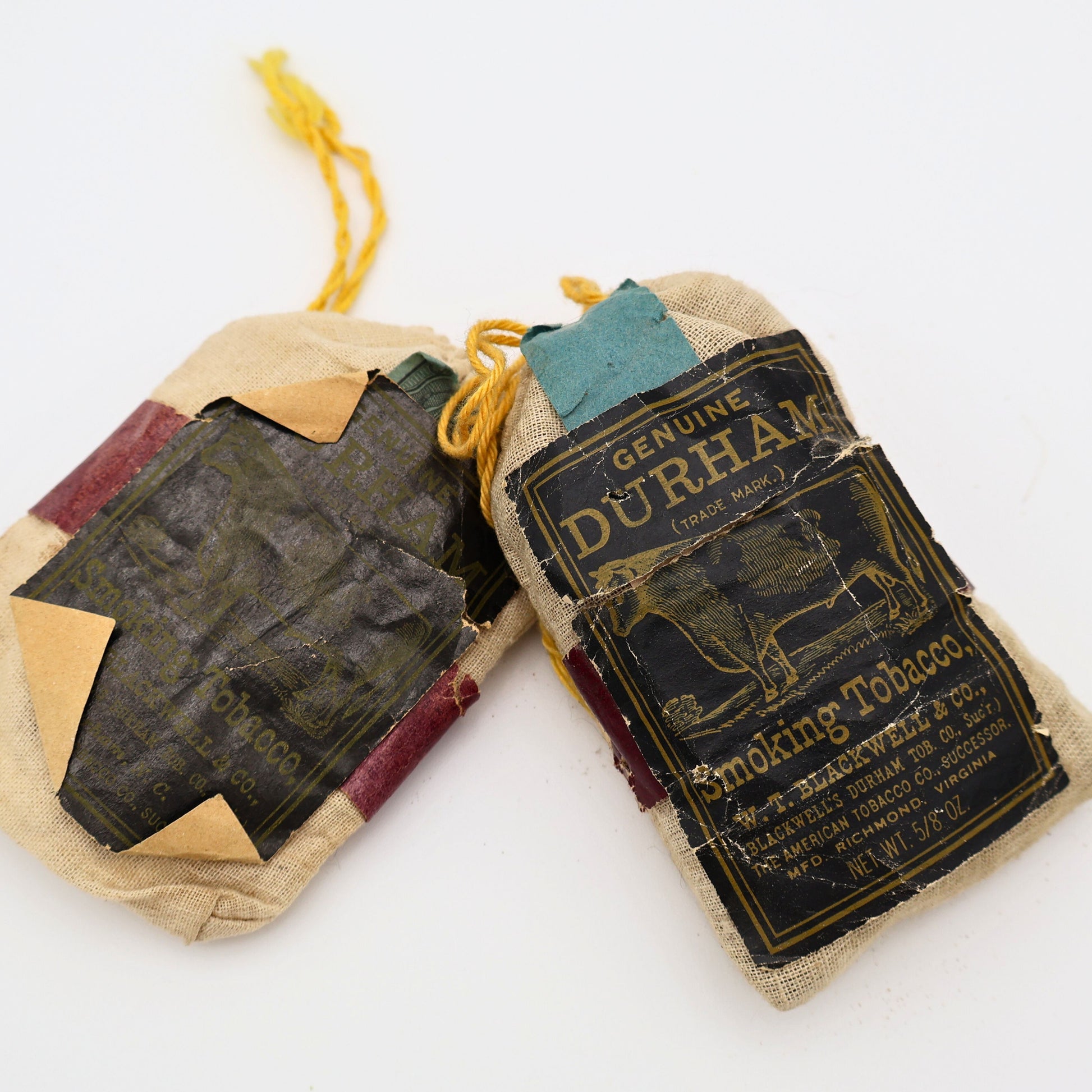 This listing is for a lot of two (2) original Bull Durham cloth tobacco pouches, produced by W. T. Blackwell & Co. of Durham, North Carolina, one of the most iconic names in American tobacco history.