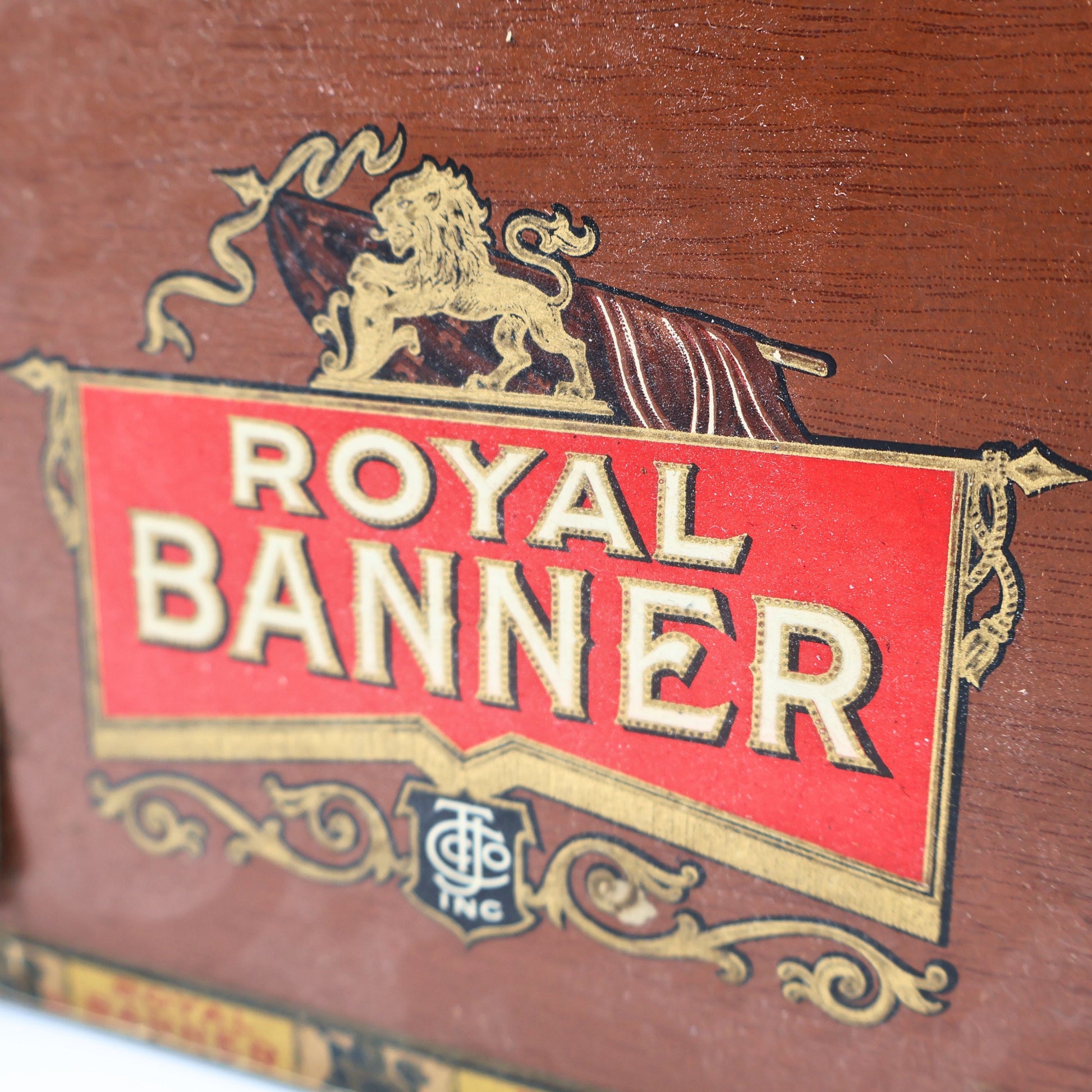 This is an authentic antique Royal Banner wooden cigar box produced by the Tegge-Jackman Cigar Company of Detroit, Michigan, dating to the early 20th century.