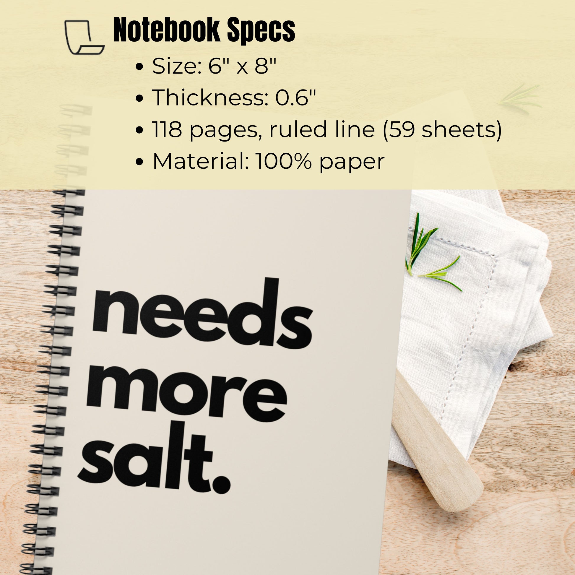 - Premium 6x8 inch spiral-bound notebook with sassy "Needs More Salt" statement