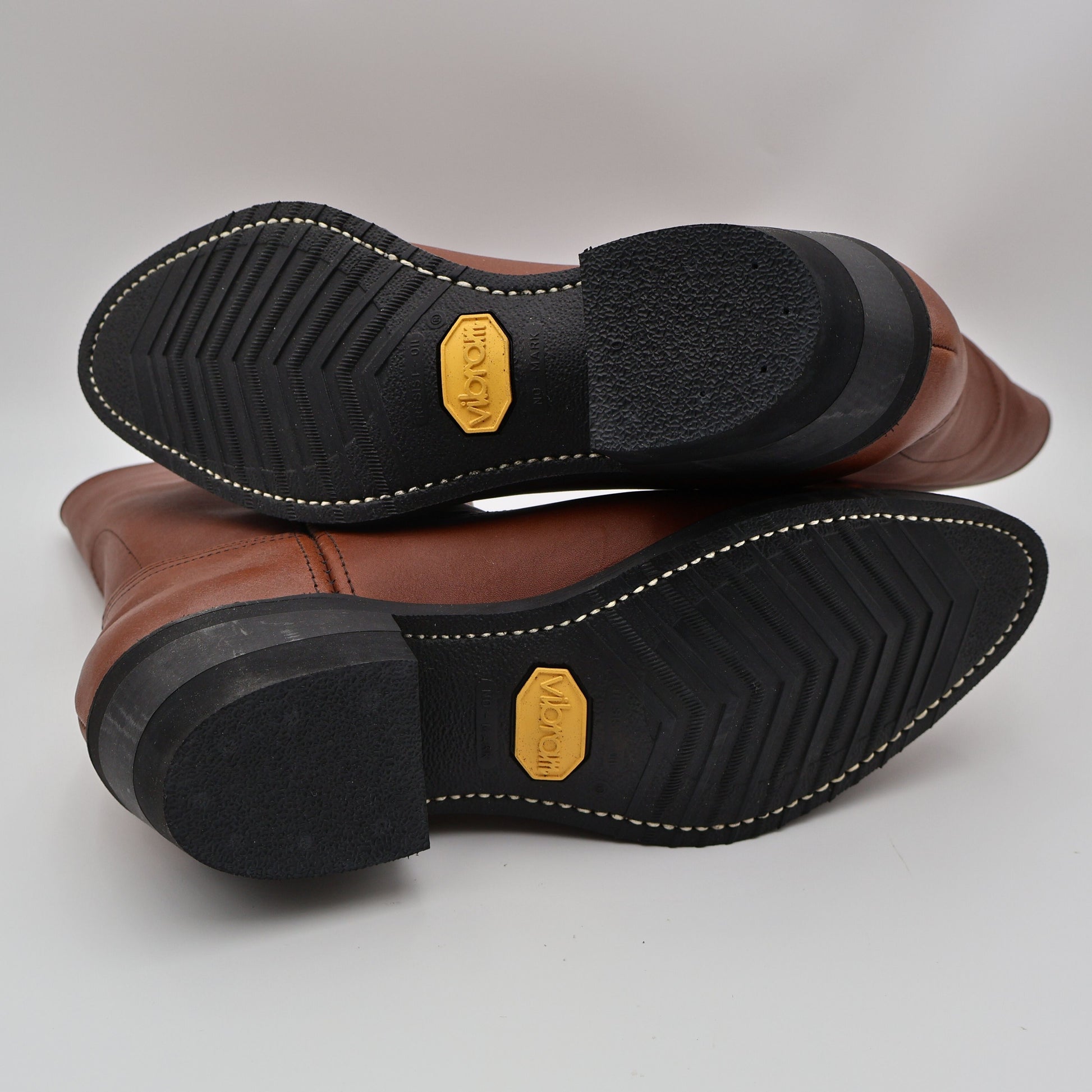Crafted in the USA from full-grain brown leather, these boots feature classic Western styling and durable, oil-resistant Vibram soles. Mason Western boots are no longer produced, making unworn pairs increasingly hard to find.