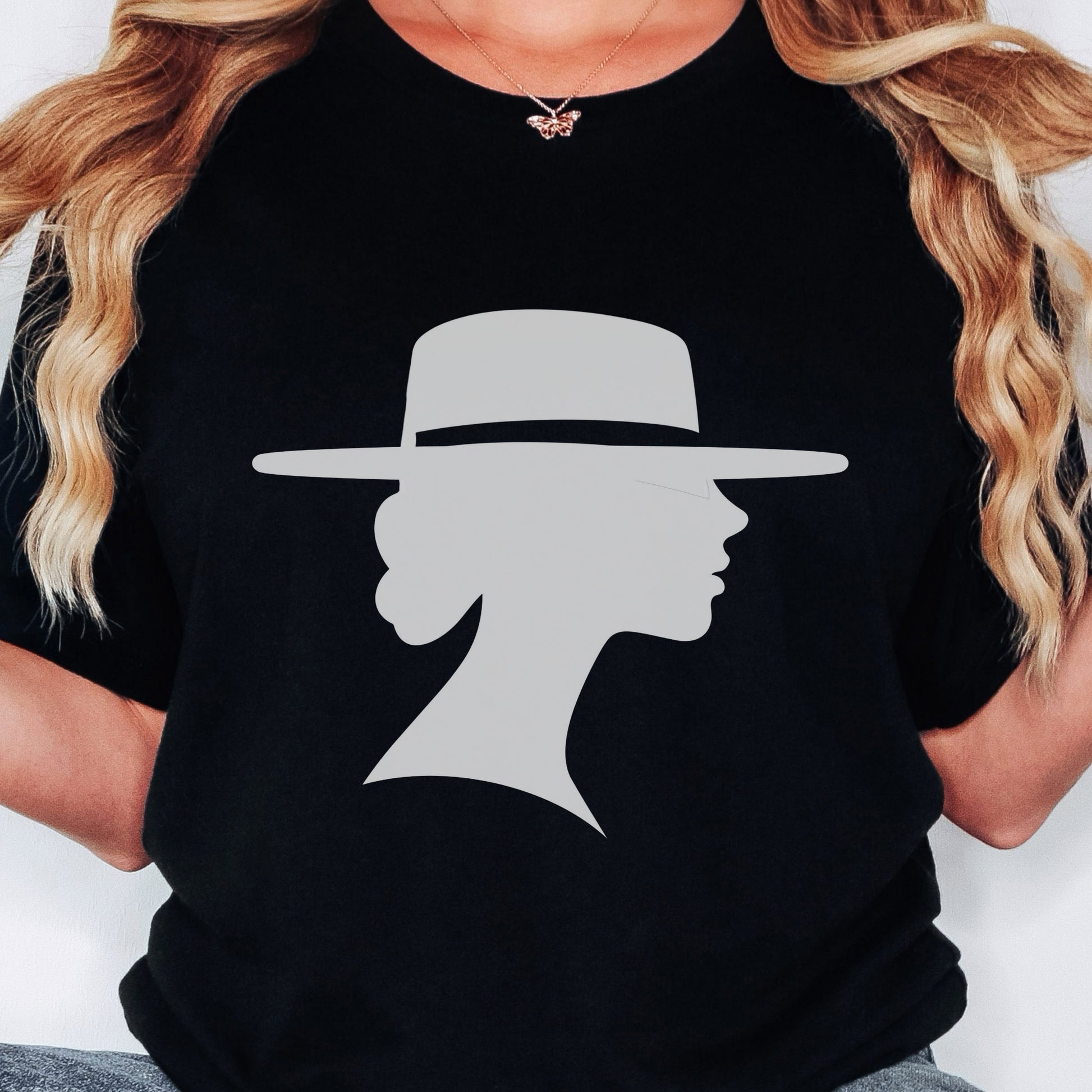 Make a statement in this Wide Brim Hat Silhouette Tee, a retro inspired graphic shirt for women who love timeless flair. This vintage style gift idea for her brings a bold fashion edge, glam style, and effortless diva look all in one tee.